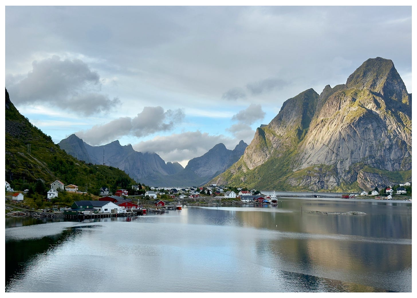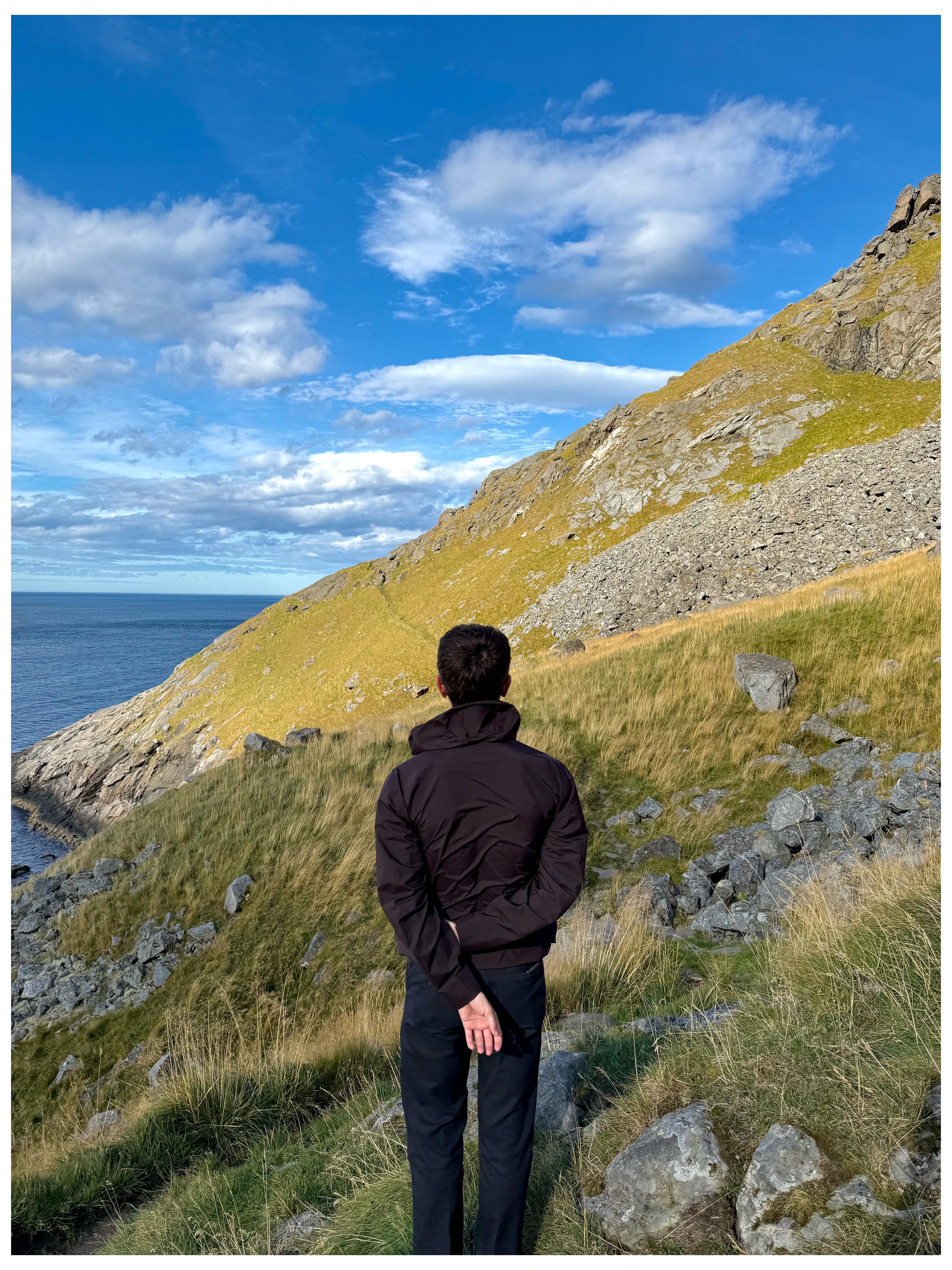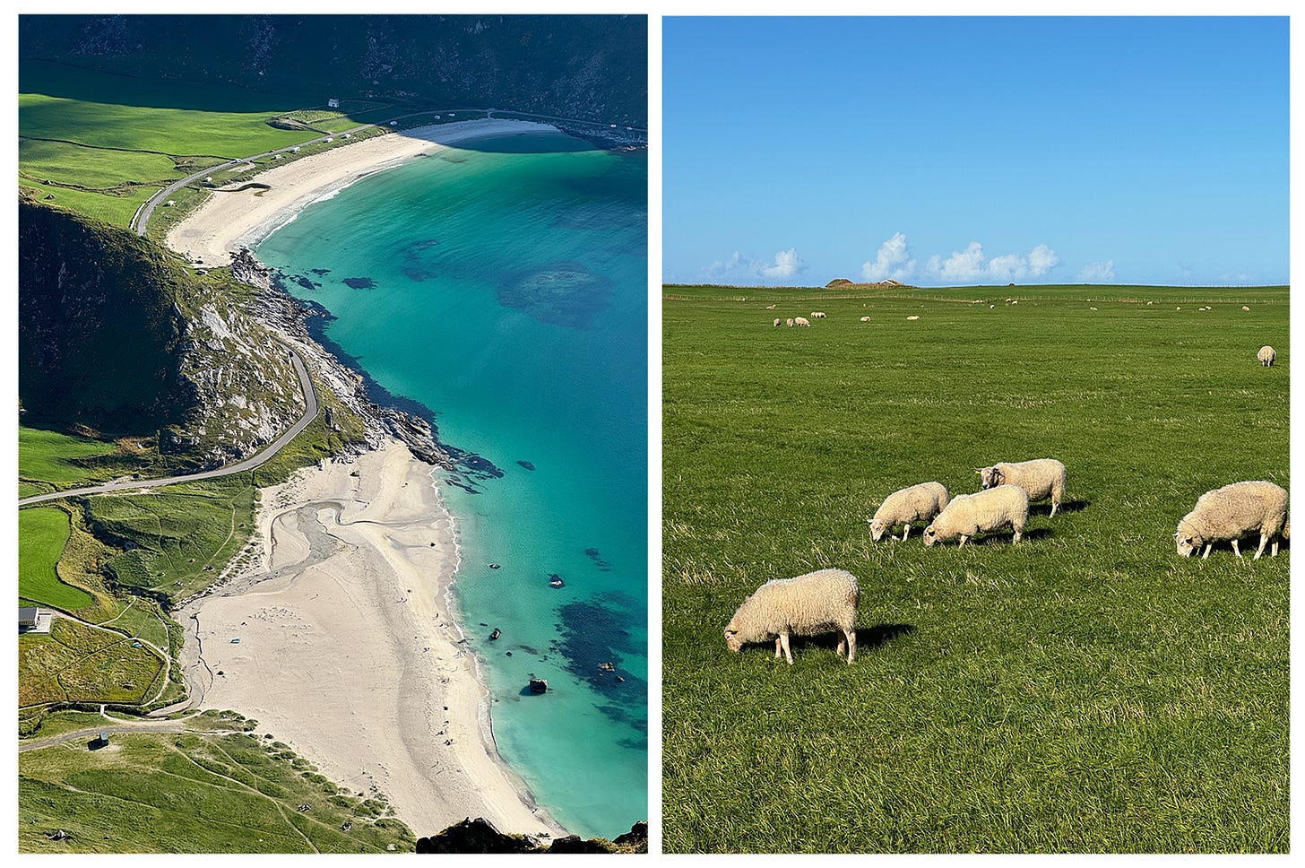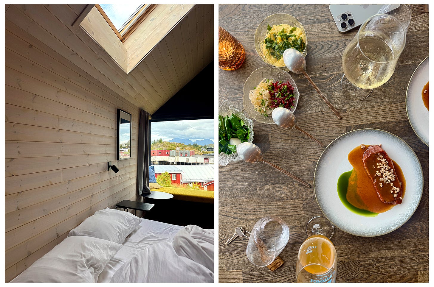 Today, we sweat in the sauna and plunged 12 feet off of a dock (fully naked) into the Norwegian sea. My breath escaped me as my lungs tightened in complete contrast to the peace in the windless air. Honestly, it was f*cking freezing — as one could assume the Arctic would be — yet totally euphoric at the same time. We drove around the Lofoten Islands in search of a hike, then refueled with local pale ales, cinnamon rolls, and ridiculously good carrot soup. White sheep speckled the hillsides, and each mountain peak looked so lush it demanded to be plastered onto a damn postcard. We played cards for so long that we missed our dinner reservation and had to pick up supplies to make peanut butter sandwiches in the hotel room. After returning, we realized we accidentally purchased gluten-free potato bread that tasted god-awful. We laughed ourselves into tears, then fell asleep watching White Lotus in bed. It was perfect.